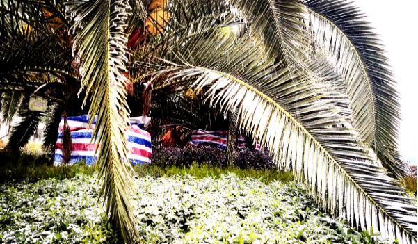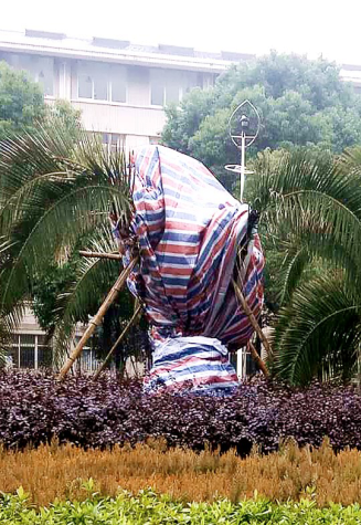 铁树的防寒措施最严密,最大的植株包裹到腰,小植株全身上下裹得像粽子。