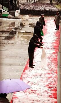 综合楼入口,环境维护中心赵训武经理带领工作人员铺设草袋和红地毯,方便教职人员出入。