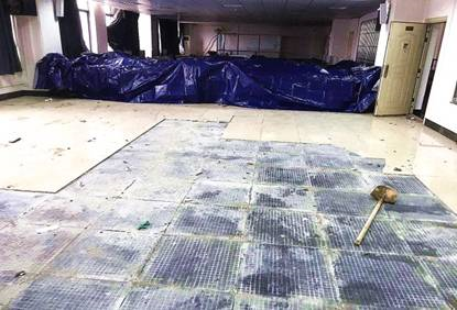 综合楼7楼多间教室地砖翘起,为保障正常的教学秩序,维护学生安全,物业维修人员在假期予以施工。