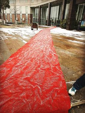 食堂入口处,食堂经理张红霞带队,就近利用资源,用红毯及纸箱铺路,做好防滑防摔工作,并公告提示大家小心慢走,防止摔倒;