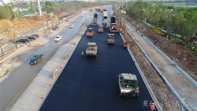 运动员进出武汉军运村的必经之路启动沥青摊铺