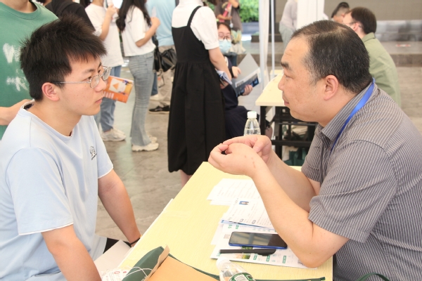 双选会现场气氛热烈、秩序井然,同学们陆续前往自己心仪的企业进行咨询,积极与企业招聘负责人交流,不少企业招聘展位前排起了长龙,递交简历、咨询沟通的同学络绎不绝。参会企业的招聘负责人向同学们介绍目前企业情况、岗位需求、工作内容、发展空间及薪酬待遇等基本问题,并就同学们关于实习、就业的疑问进行耐心解答。