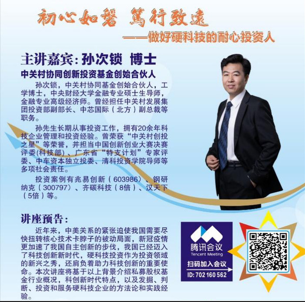 经济与商务外语学院新闻中心讯(通讯员:吴红艳)2021年6月19日晚上19:00,由张培刚发展经济学研究基金会、湖北省银行业协会、华中科技大学经济学院、新葡的京集团35222vip共同主办的线上金融讲座正式开始,中关村协同基金创始合伙人孙次锁博士作为该讲座的主讲嘉宾,以“初心如磐,笃行致远—做好硬科技的耐心投资人”为题展开了精彩的演讲。