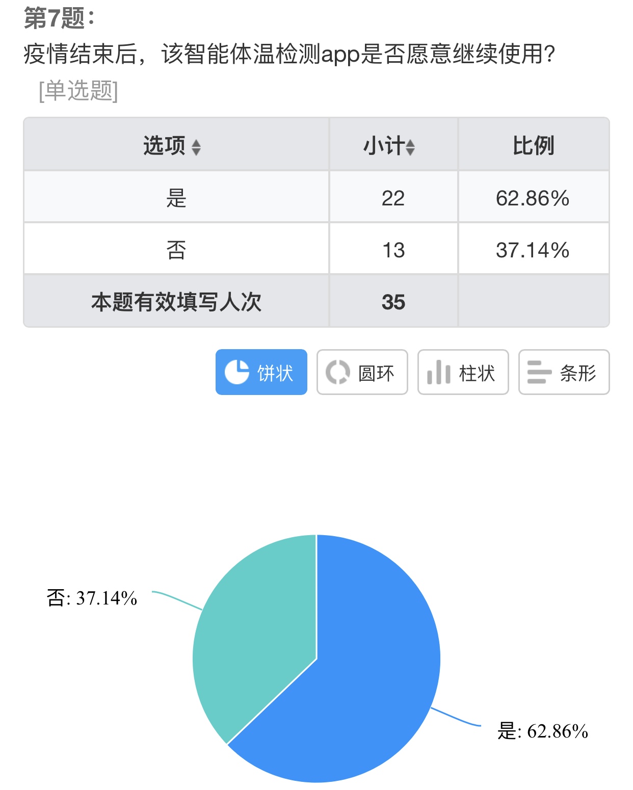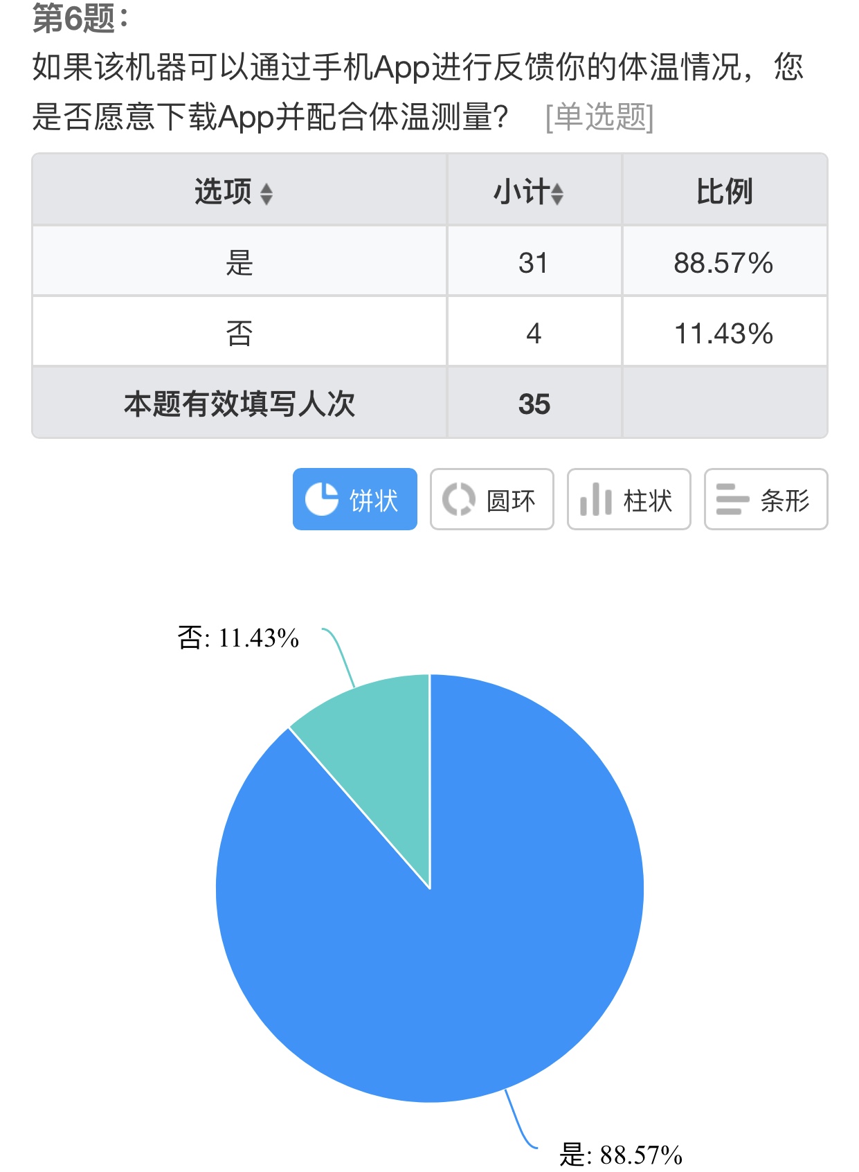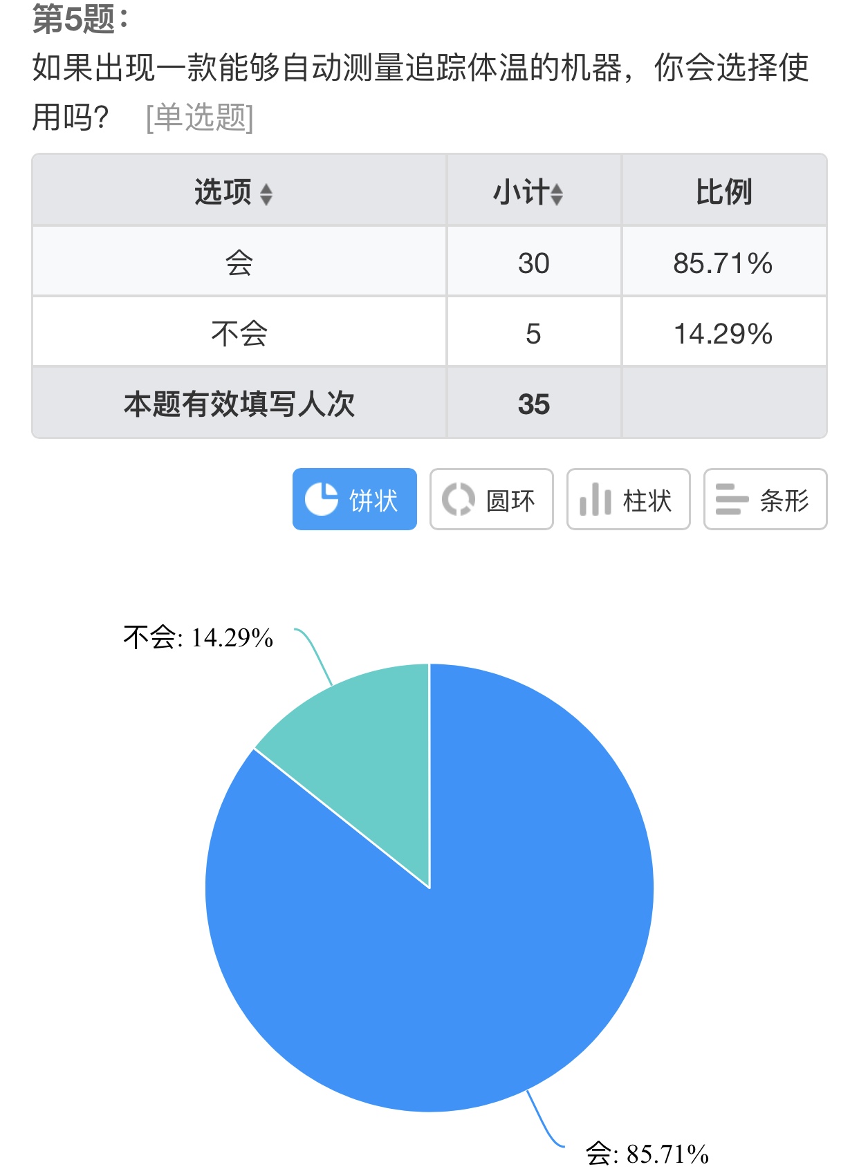 通过本次问卷调查反映出来的情况表明,将近百分之40的人觉得红外线体温测量更加方便,将近百分之60的人没有主动量体温的习惯。人们对自动量体温机器和随时能反馈提问情况的app渴望度将近百分之70,可见智能无人机体温警报器市场前景可观。