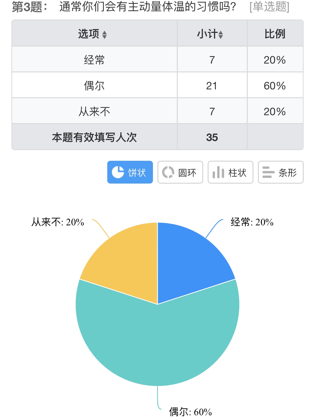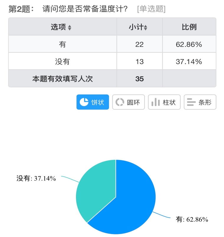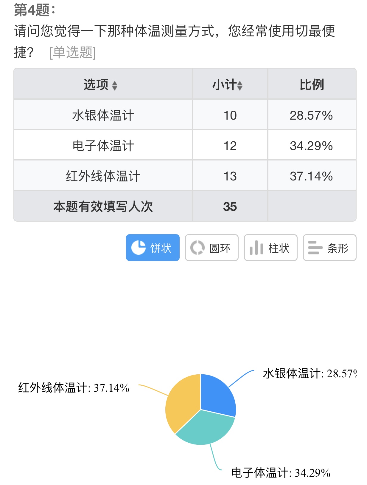 通过本次问卷调查反映出来的情况表明,将近百分之40的人觉得红外线体温测量更加方便,将近百分之60的人没有主动量体温的习惯。人们对自动量体温机器和随时能反馈提问情况的app渴望度将近百分之70,可见智能无人机体温警报器市场前景可观。