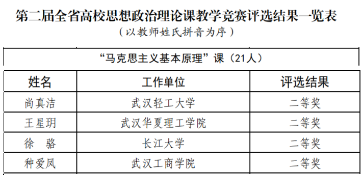 据悉,湖北省高校思想政治理论课教学竞赛由省教育厅组织,旨在推进思政课改革创新,推广一批优质教学资源和先进教学法,从而进一步提高思想政治理论课教师的教学能力和水平,提高思政课的针对性和吸引力。截至目前为止,已经举办了两届。