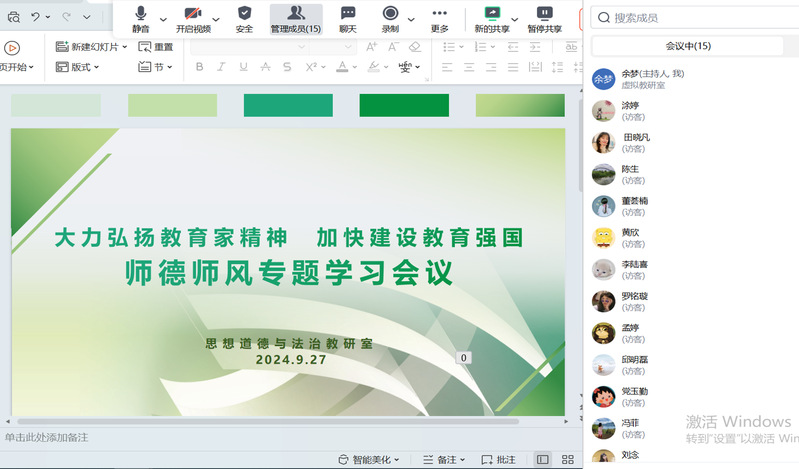 (通讯员 余梦)2024年9月27日“思想道德与法治”课程组在学院会议室举行了一场师德师风专题会议,会议主题为“弘扬教育家精神 加快建设教育强国”,旨在围绕“立德树人”的根本任务,深入探讨新时代背景下思政教师的角色定位、职责使命以及师德师风建设的具体路径。此次会议不仅为教师们提供了一个交流分享的平台,更为构建良好的师德师风环境奠定了坚实基础。