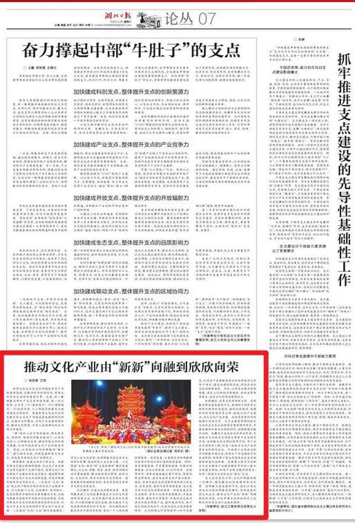 (通讯员 姜倩)近日,《湖北日报》理论版“论丛”栏目,刊发我校马克思主义学院教师柯贤柳和艾萍联合撰写的《推动文化产业由“新新”向融到欣欣向荣》一文。该文联系思政教学实际,拓展思政育人视野,融入实践热点,将论题锚准新型文化业态,锲入马克思主义理论和实践结合点、平衡点,尝试激活思政融合教育的“一池春水”。不积跬步,无以至千里。马院在长期的坚守、积累和沉淀中,厚积薄发,实现在省级及以上权威理论阵地发文的突破。未来,接力棒将会在马院持续传递。具体文章如下: