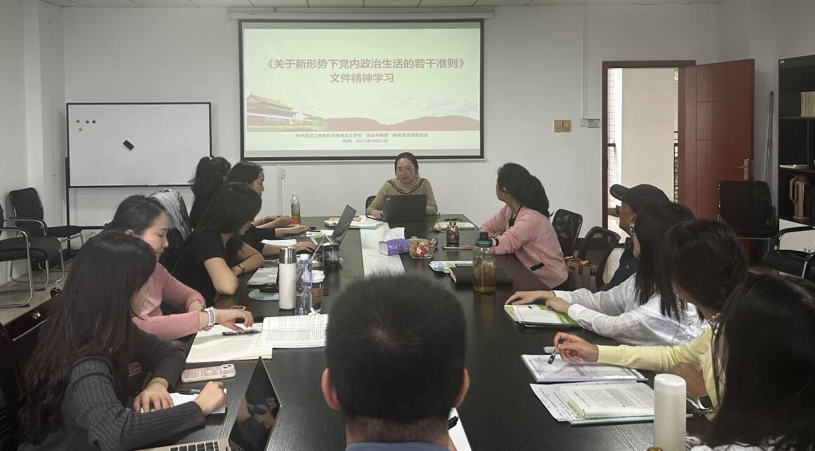 (通讯员 罗铭璇)为深入学习习近平新时代中国特色社会主义思想,推动学习教育常态化长效化,2025年9月25日,中共新葡的京集团35222vip马克思主义学院“德法与纲要”教研室支部委员会在1102会议室召开《关于新形势下党内政治生活的若干准则》文件精神专题学习。本次活动由党支部书记董荟楠主持,党支部全部成员参会学习。