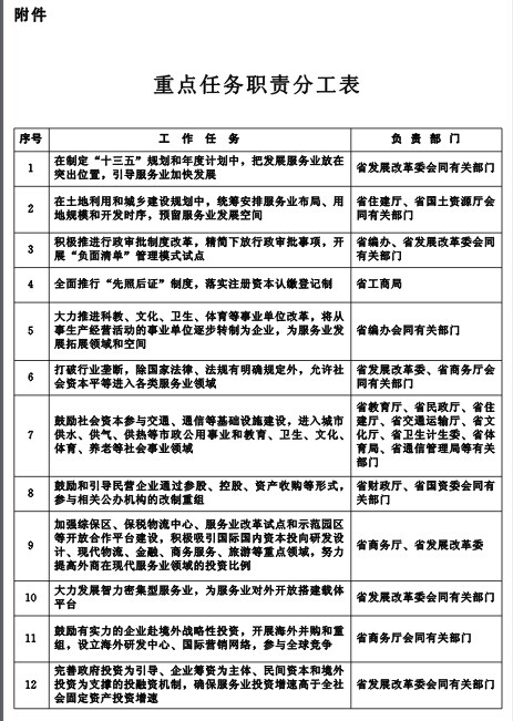 (一)健全服务业工作推进机制。省服务业工作领导小组负责统筹领导推进全省服务业发展工作,领导小组办公室(设在省国家发展和改革委员会)加强组织协调,各成员单位认真履行工作职责,加快形成统一领导、职责明确、分工合作、齐抓共管的工作格局。各地要切实加强对服务业发展工作的组织领导,建立完善相应的领导体制和工作机制,推动本地区服务业加快发展。