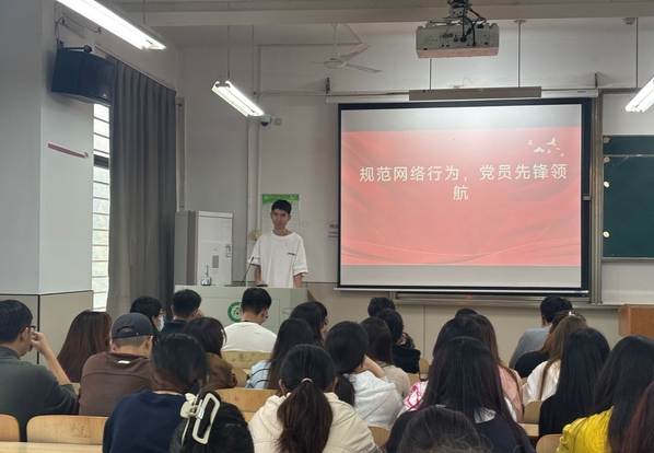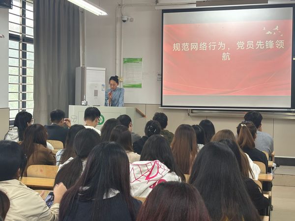 接着由主讲人钱梦引以“规范网络行为,党员先锋领航”为主题展开讲解。她首先指出《党员网络行为规定》出台的背景,网络谣言、恶意营销和历史虚无主义频发,个别党员的不当言论损害党组织形象。然后,钱梦引对关键条款进行了解读。第一,关于政治纪律红线,她列举网络场景中的“两个维护”禁令,提醒党员勿妄议中央、勿参与非法串联或宗教渗透。第二,对于网络道德高线,倡导党员弘扬社会主义核心价值观,主动澄清谬误、抵制网络暴力,对“算法歧视”“大数据杀熟”等不良现象亮剑,并通过“亮身份、作承诺、受监督”机制,把先进性转化为点赞、转发、评论中的可见示范。