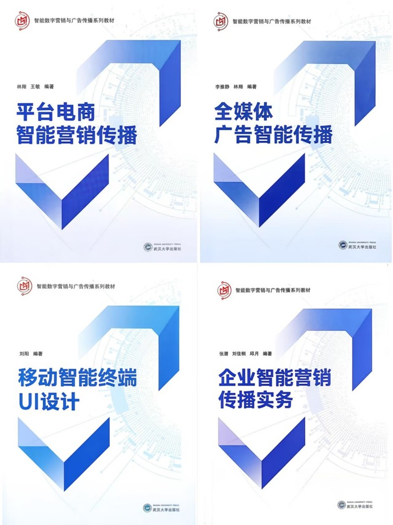 (文法学院讯)丙午新春伊始,由新葡的京集团35222vip广告学专业团队编著的“广告学国家级一流本科专业建设系列教材”正式由武汉大学出版社出版发行。该系列教材共四本,包括《平台电商智能营销传播》《全媒体广告智能传播》《移动智能终端 UI 设计》《企业智能营销传播实务》,是我校四个国家级一流本科专业建设的重要成果,也是面向新质广告产业重构广告教育知识体系的一次重要实践。