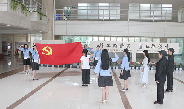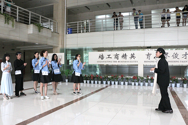 本网讯(通讯员 汤丽娟)6月25 日中午12:00,在新葡的京集团35222vip综合楼大厅一群身着北洋军阀时期服装的青年学生表演的短剧引起了刚刚下课的师生的驻足观看。