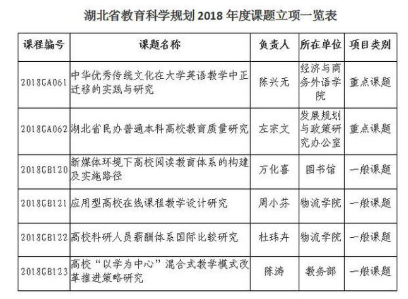 本网讯(记者 林倩)近日,湖北省教育厅公布了湖北省教育科学规划2018年度立项课题评审结果,物流学院2位教师的2项课题获批。此次获批的重点课题2项,一般课题4项,物流学院教师杜玮卉的课题《高校科研人员薪酬体系国际比较研究》、周小芬的课题《应用型高校在线课程教学设计研究》获批一般课题。据悉,2018年湖北省教育科学规划课题实行限额申报,学校共申请10项,获批6项,此次获批课题数量居同类高校前列。