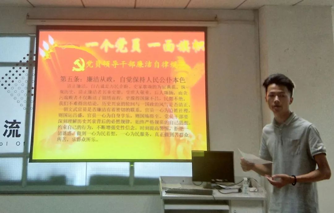随后,学生党员苟长江和黄力力分别以个人经历和案例分析为大家进一步解析了党员廉洁自律准则的内涵。并号召同学们要严于律己,争做新时代合格党员。