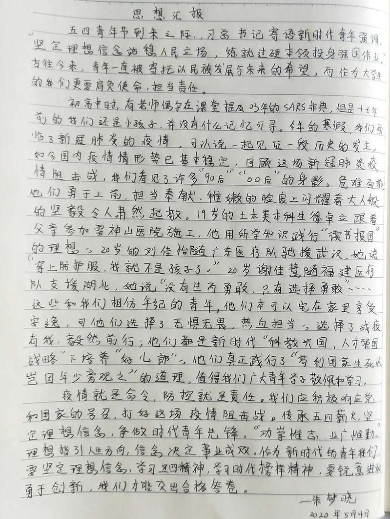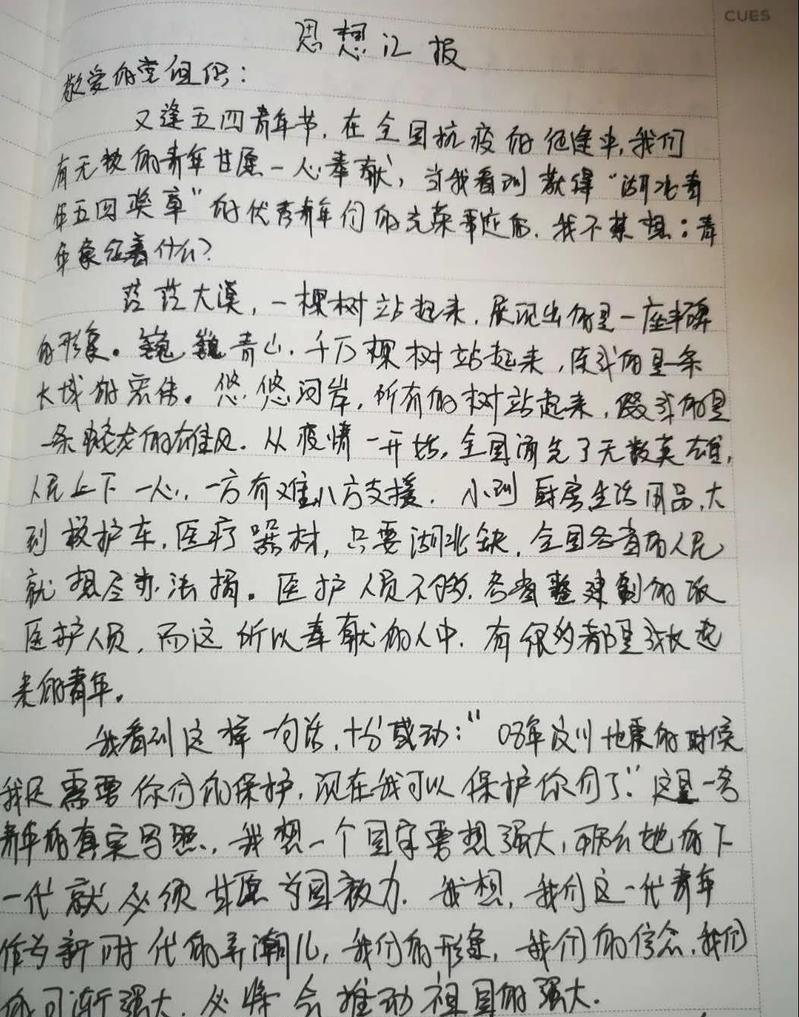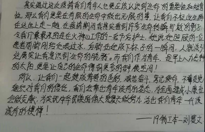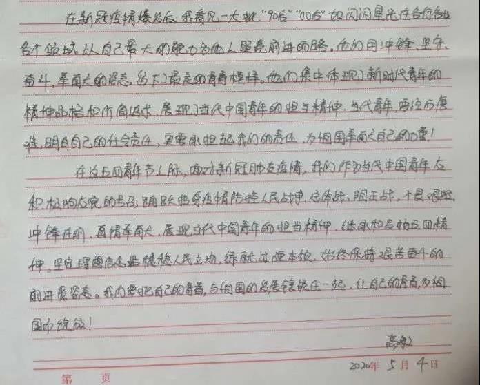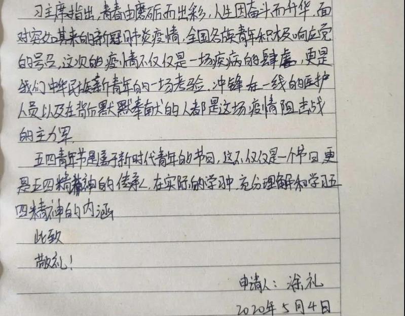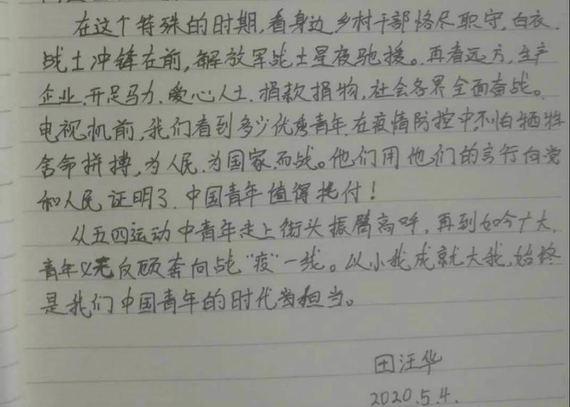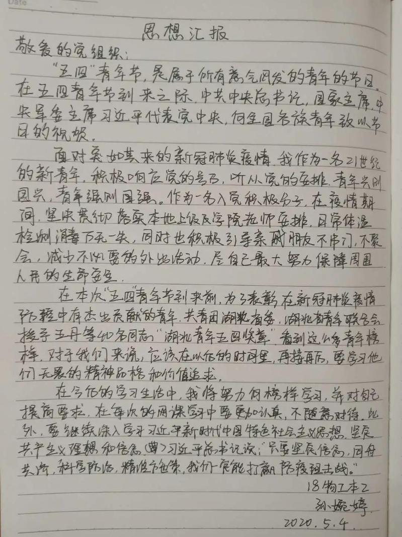2020年5月4日,是五四运动爆发101周年纪念日。这一天,物流学院的入党积极分子和学生党员们,通过学习习近平总书记对全国各族青年寄语、共青团中央和共青团湖北省委的五四表彰决定,以及近段时间以来,活跃在抗疫一线的青年们的先进事迹,以手写心得体会的形式,向先进们学习,向先进们看齐!