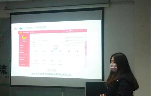 分团委副书记杨婷婷介绍了分团委本学期的工作情况:物流学院分团委学生会代表队在第一届广场舞大赛中荣获二等奖、智慧团建2020年毕业生学社衔接率高达90%以上,位列全校衔接率第一、“大爱成人礼”、“秋暖花茶”、第七届“百蝶杯”物流仿真设计大赛”等一系列活动顺利举办,丰富了同学们的校园生活,展现出了物流学子充满活力青春向上的昂扬姿态。在总结经验的同时,杨婷婷同学也客观分析了工作中存在的不足,她说道:“作为分团委副书记,在今后的工作中应更加及时的组织开展学生活动,增加学院学生组织的亲密性、合作性,加强各组织、各部门以及部门成员之间交流,提高学生干部工作积极性。”
