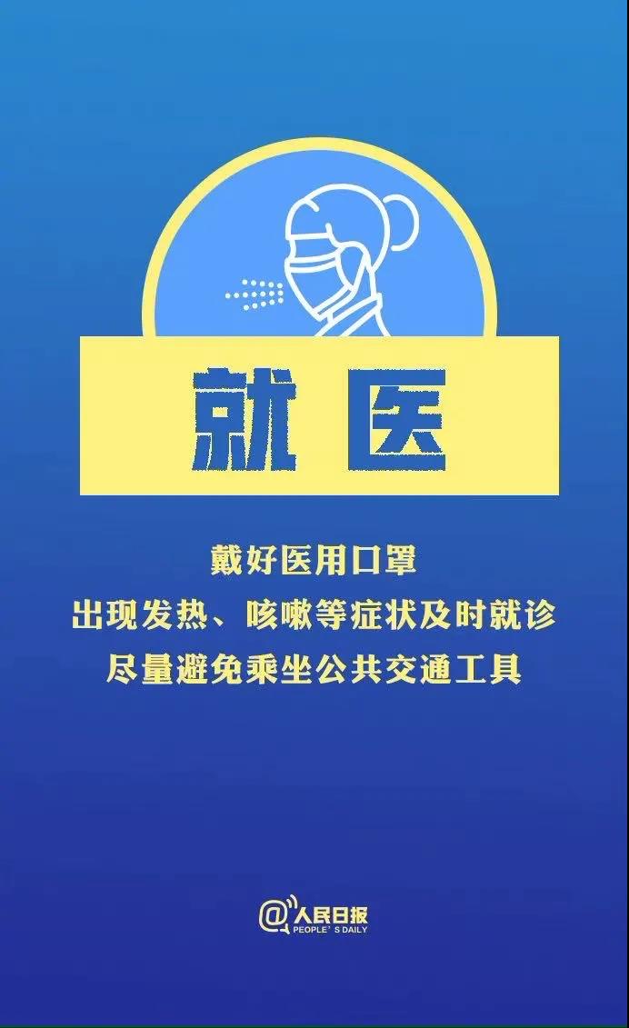 出现发热、咳嗽、腹泻、乏力等症状时,要佩戴一次性医用外科口罩,及时到就近发热门诊就诊,就医过程中尽量避免乘坐公共交通工具。