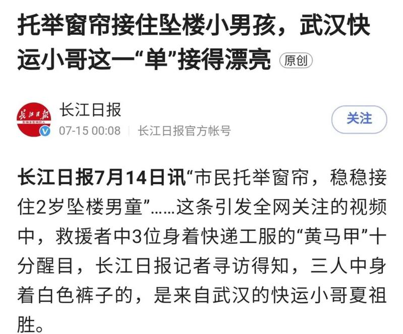 那天下午14时左右,担任中外运—敦豪国际航空快件有限公司湖北分公司汉口服务中心外勤组长的夏祖胜正在河北石家庄出差,在看到这惊险一幕时,快速奔跑至男童正下方的位置,并让同事立即联系楼栋邻居要来窗帘,招呼周边群众在男童的正下方拉开窗帘,随时准备接住坠落下来的男童。大概过了5分钟以后,体力不支的男童松开了双手,坠落下来,在男童坠楼的那一瞬间,大家托举起的窗帘将他稳稳地接住,使其转危为安。在确认孩子平安无事,并交给家长后,夏祖胜才与两位同事悄然离开。