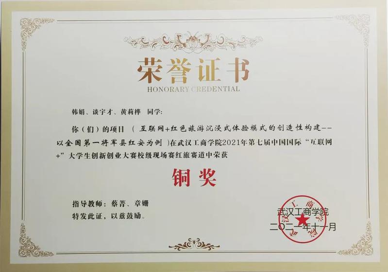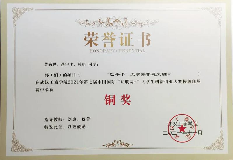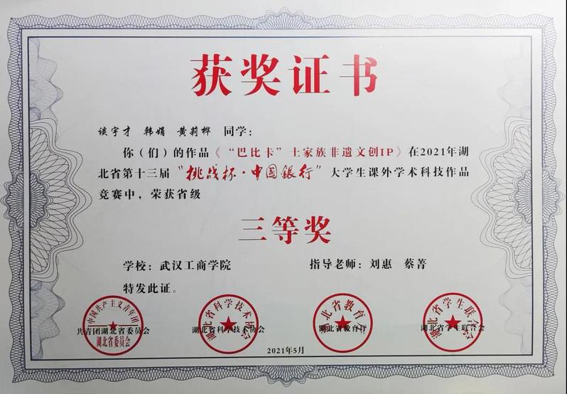 热衷科研,求实进取,不断培养自己严谨科研思维和专业素养水平。他参与的课题《阿创猫--电商平台下土家族传统文化产品的发展》荣获“校级重点项目并立项”;荣获2021年湖北省第十三届“挑战杯·中国银行”大学生课外学术科技作品竞赛校级三等奖、省级三等奖;2021年第七届中国国际互联网+大学生创新创业大赛高校主赛道校级铜奖、红旅赛道校级铜奖;在今年11月份的“百蝶杯”第七届全国大学生物流仿真设计大赛选拔赛中,他所在的团队荣获校级一等奖,国家级三等奖。