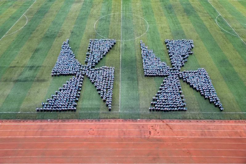 在花样方阵汇演中,1250名新生带来了精彩纷呈的表演,向祖国献礼,震撼全场。随着音乐和口令的变化,他们依次变换出“青春有为”“强国有我”“幸会武工商”“风车”“国家”“1949-2023”“74”“学在武工商”等图案和字样,并通过《国家》手语舞的形式,表达对国家炽热的情感,祝福伟大的祖国繁荣昌盛。