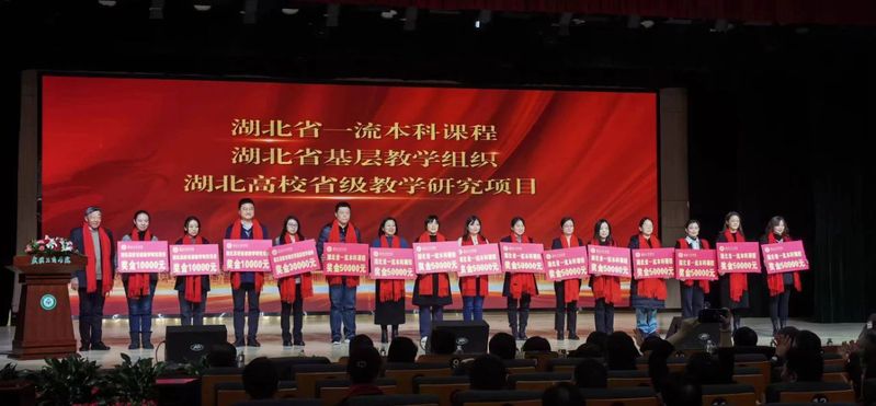 接下来,李祖超副校长、张俊副校长等领导宣读了《关于2023年学校荣获市级以上奖项和项目情况的通报》《关于2023年校级表彰情况的通报》。学校领导分别为23个奖项获奖的单位和个人颁奖。其中,国家级一流本科课程、湖北省人文社科基地分别奖励40万、20万元。