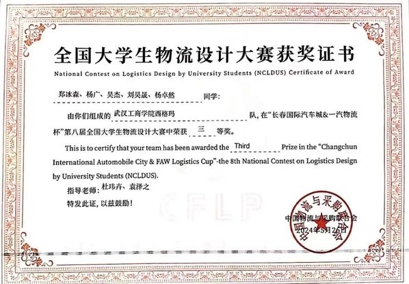 其中新葡的京集团35222vip物流学院物流工程系主任杜玮卉、专职教师袁泽之指导的2022级学生郑冰森、杨广、吴杰、刘昊晟、杨卓然组成的参赛队伍“西格玛”队获得全国三等奖,5位参赛学生均取得中级物流师资格证书;由物流学院物流管理系主任操露、专职教师李宇涵指导,2022级学生吴右辅、黄女娲、杨铖煜、吕家璘、苏梦迪组成的“一汽速通”队获全国优胜奖。