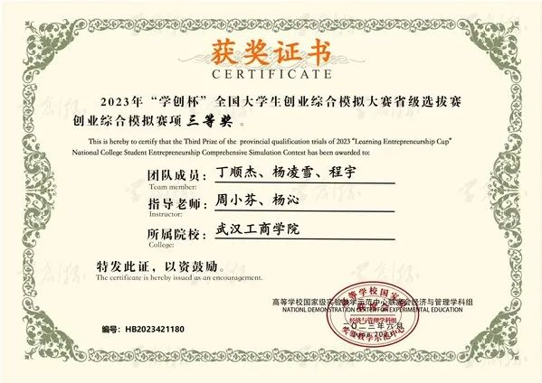 图为杨凌雪所获“学创杯”全国大学生创业综合模拟大赛省级三等奖荣誉证书