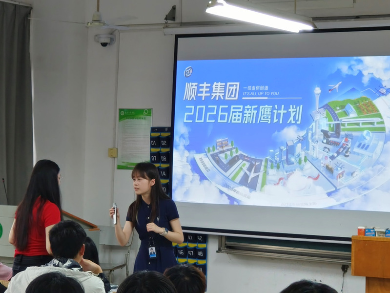 随后,校招负责人吴祎从集团发展历程、培养计划、岗位内容、面试流程四个维度,为学生们全面介绍了顺丰集团的基本情况。针对学生们普遍关心的职业发展问题,宣讲人不仅详细讲解了应聘岗位的报名方式、面试流程以及薪酬福利,还特别介绍了吴家山“智慧中转场运营”项目。该项目在智能分拣、自动化仓储、绿色物流等领域创新应用成果显著,吴家山中转场作为顺丰华中区域核心枢纽,已实现90%包裹自动化分拣。实习生将有机会深度参与该项目,在真实的业务场景中掌握物流自动化与智能化技术,为个人职业发展增添核心竞争力。宣讲人热情地向广大学生发出邀请,欢迎他们到吴家山场站实习。