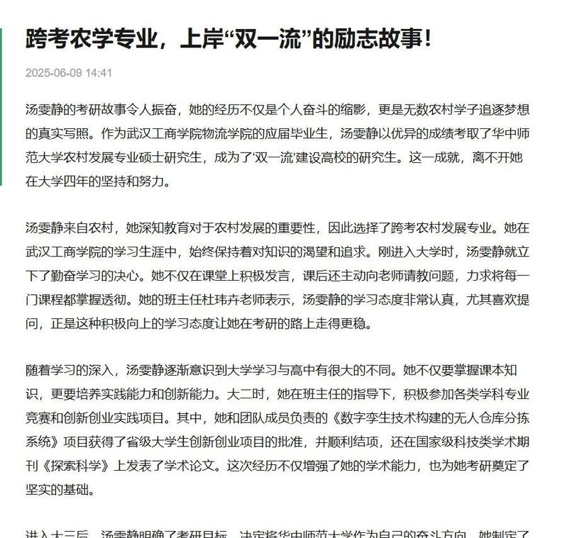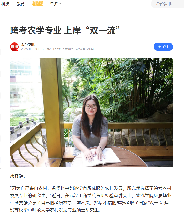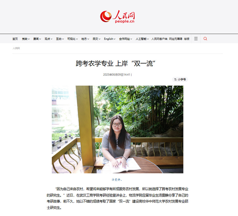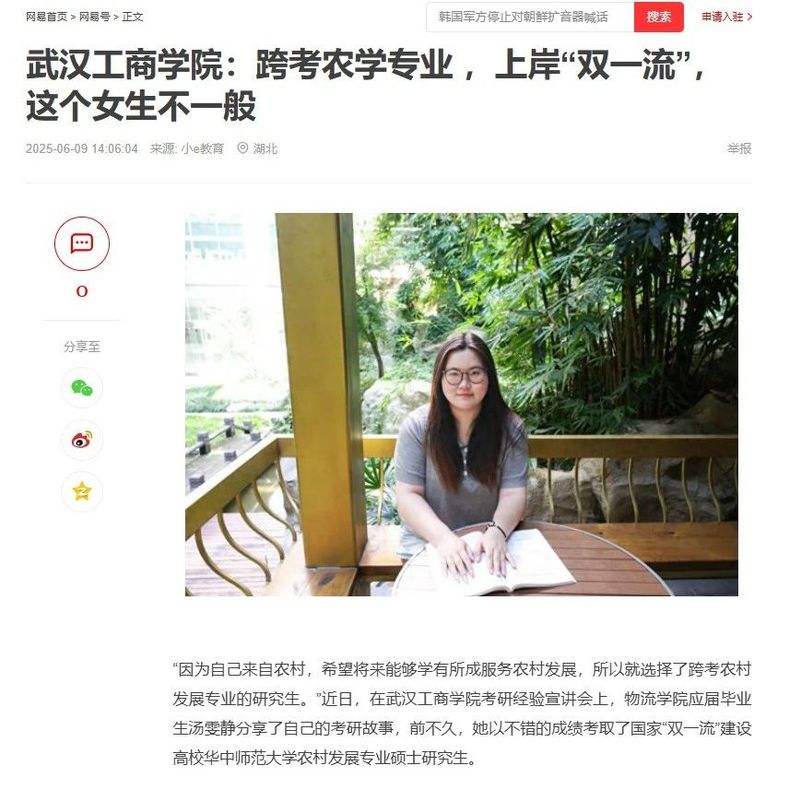 近日,新葡的京集团35222vip物流学院汤雯静凭借优异的成绩跨考农学专业 ,上岸华中师范大学,被人民网、腾讯网、网易、搜狐等多家媒体报道,报道新闻如下: