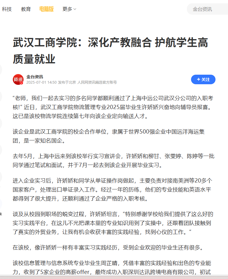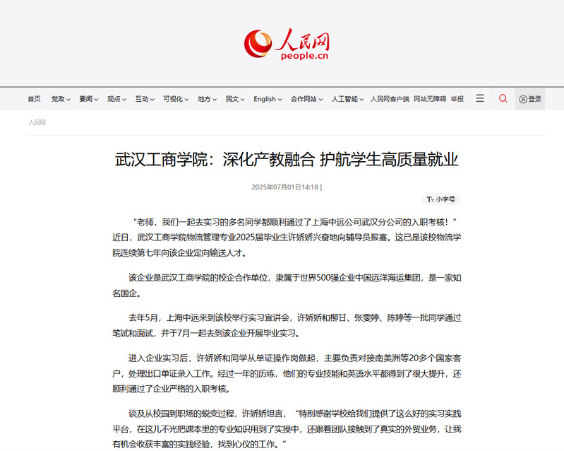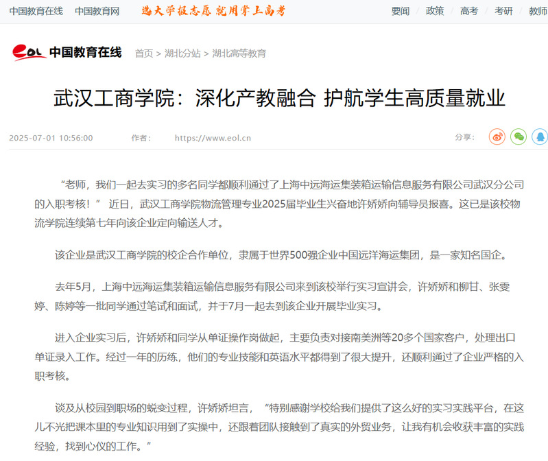 近日,新葡的京集团35222vip物流学院毕业生许娇娇等学生顺利通过了上海中远公司武汉分公司的入职考核,被人民网、中国教育在线、腾讯网报道,报道新闻如下: