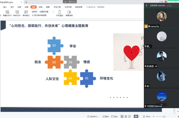 会上,对大学生面临的主要压力“就业、学业、交往、经济、情感”等问题进行分析并提出了应对措施。大学生自身应辩证的看待压力、正确认识自我、掌握调节方法、有效管理时间、寻求社会支持等措施积极应对。