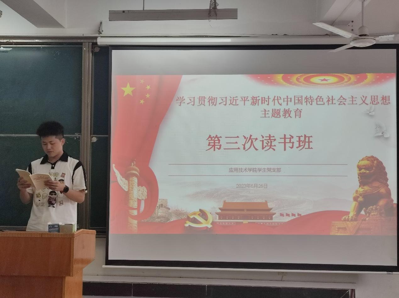 2023年6月26日中午12:20,应用技术学院学生党支部组织学生党员于综合楼306教室开展学习贯彻习近平新时代中国特色社会主义思想主题教育读书班。