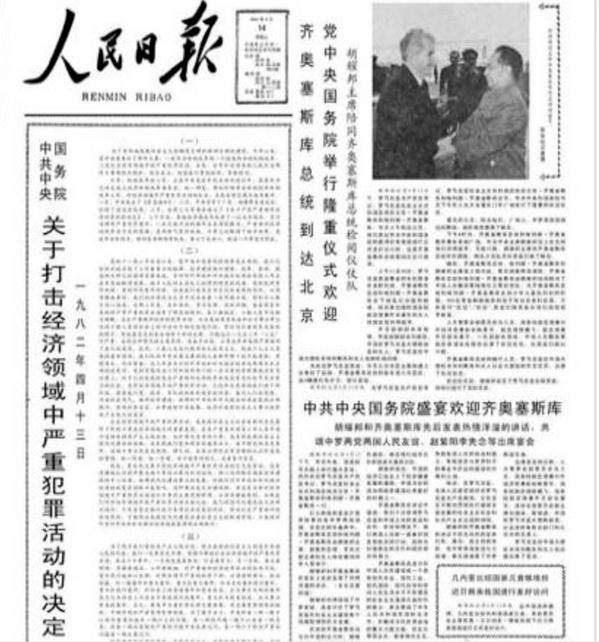 1982年4月13日,中共中央、国务院公布《关于打击经济领域中严重犯罪活动的决定》。《决定》尖锐地指出:打击经济领域的严重犯罪活动,进行反对腐化变质的斗争,关系到我国社会主义现代化建设的成败,关系到我们党和国家的盛衰兴亡,这场斗争必然是长期的持久的。此前的4月10日,邓小平在中共中央政治局讨论这一决定的会议上指出:我们必须坚持社会主义道路的四项必要的保证,即:第一,体制改革;第二,建设社会主义精神文明;第三,打击经济犯罪活动;第四,整顿党的作风和党的组织,包括坚持党的领导,改善党的领导。在实现四个现代化过程中,我们要有两手,一手就是坚持对外开放和对内搞活经济的政策,一手就是坚决打击经济犯罪活动。