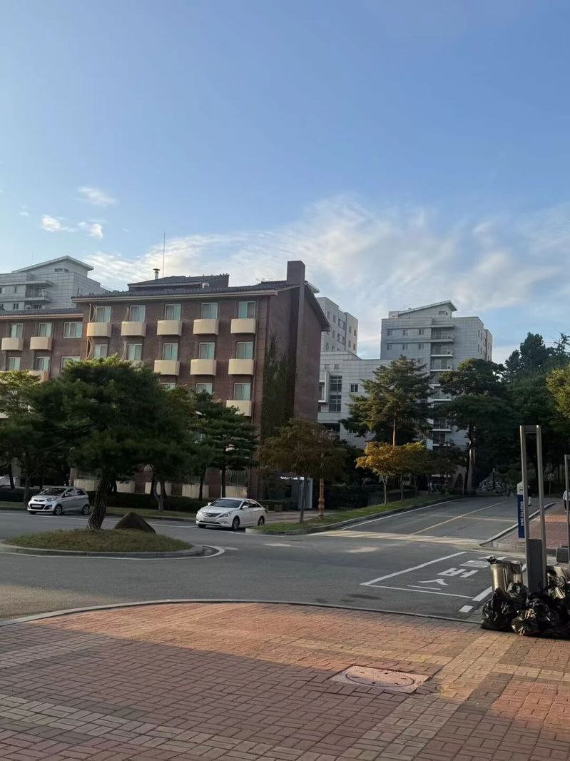 从课堂走出来,红棕色与白色相间的建筑在蓝天下显得宁静而有序。她喜欢在这样的街道上慢慢走,看树叶从绿转黄,看车辆安静地停靠。